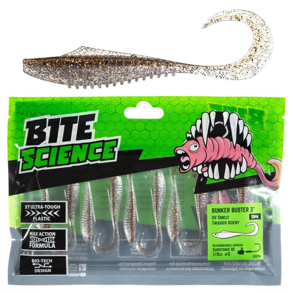 10 Pack of 3 Inch Bite Science Bunker Buster Soft Plastic Lures - UV Smelt