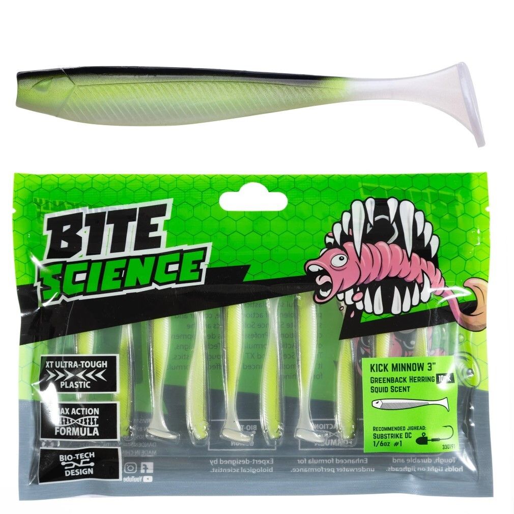 10 Pack of 3 Inch Bite Science Kick Minnow Soft Plastic Lures - Greenback Herring