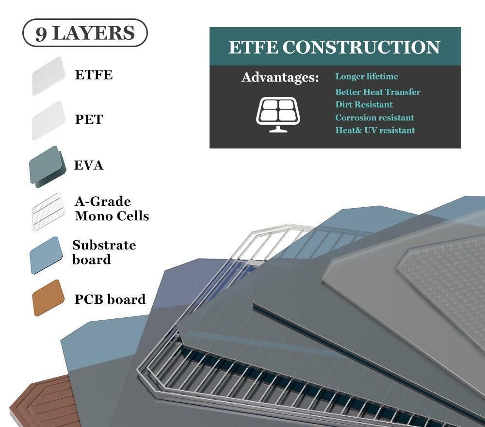 These panels are constructed with highly efficient solar cells supported in a unique polymer that allows for flexibility and significant weight reduction. These panels have no aluminum or steel frames which means they are extremely lightweight. At just 2mm thick and weighing 3kg, they are the thinnest and lightest panels available in the world.