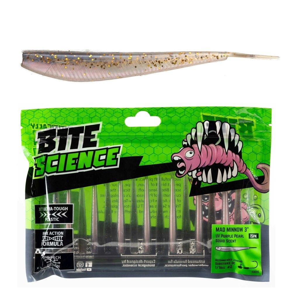 15 Pack of 3 Inch Bite Science Mad Minnow Soft Plastic Lures - UV Purple Pearl