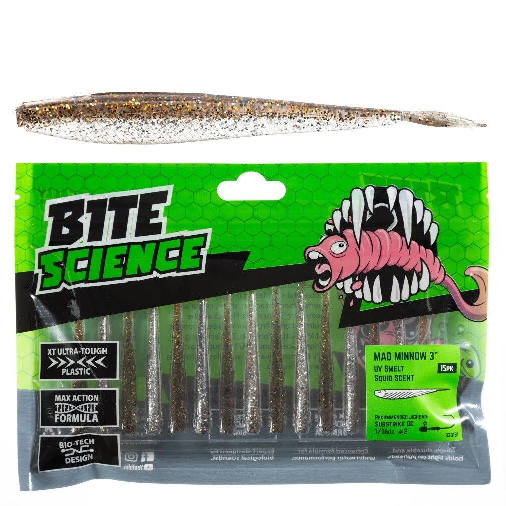 15 Pack of 3 Inch Bite Science Mad Minnow Soft Plastic Lures - UV Smelt