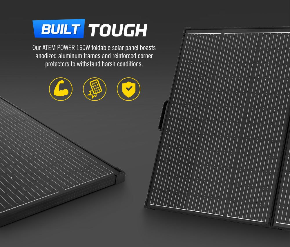 Built Tough: Our ATEM POWER 160W foldable solar panel boasts anodized aluminum