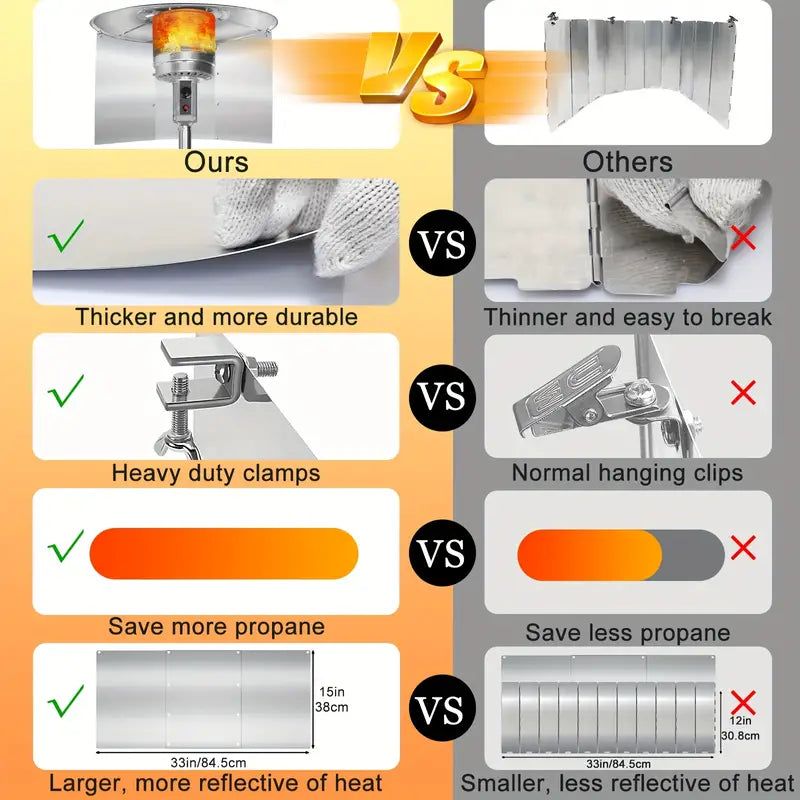 Experience directional heating by adjusting the reflector shield to direct warmth precisely where you want it. Whether you're hosting a backyard barbecue or enjoying a quiet evening under the stars, our 3 Panels Reflector Shield enhances your outdoor comfort, extending your outdoor enjoyment well into the cooler seasons.