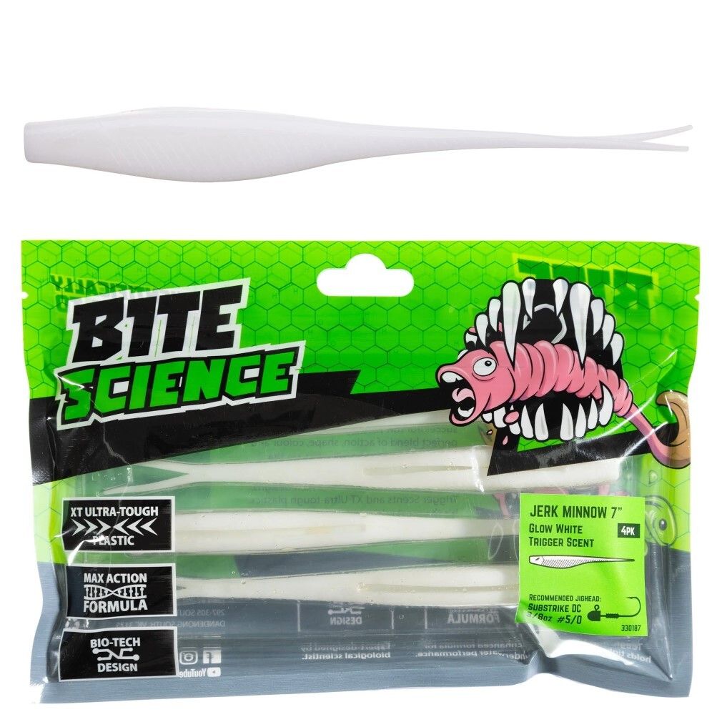 4 Pack of 7 Inch Bite Science Jerk Minnow Soft Plastic Lures - Glow White