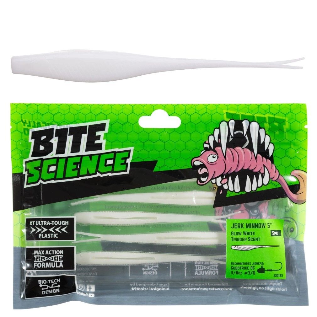 5 Pack of 5 Inch Bite Science Jerk Minnow Soft Plastic Lures - Glow White