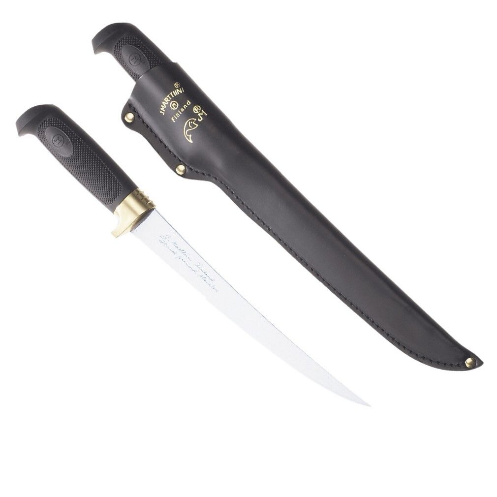 The filleting knife is supplied with a black leather sheath.