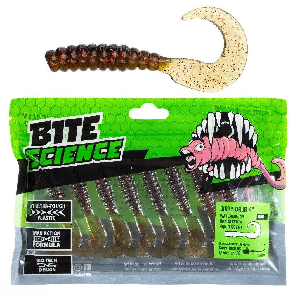 8 Pack of 4 Inch Bite Science Dirty Grubs Soft Plastics - Watermelon Red Glitter
