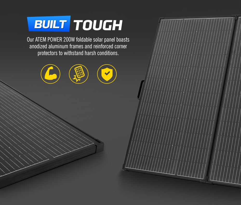 Built Tough: Our ATEM POWER 200W foldable solar panel boasts anodized aluminum