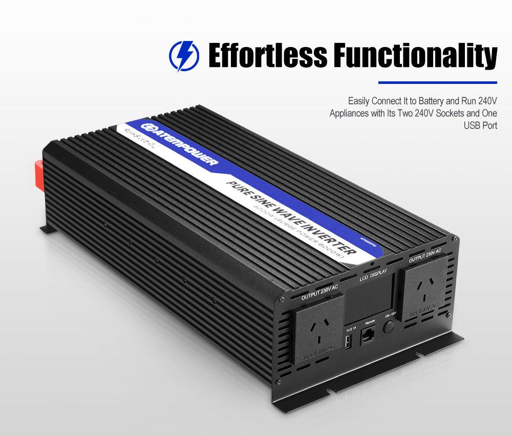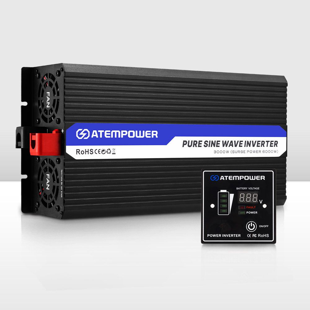 DESCRIPTIONWhether you're setting up an off-grid power system or preparing for a beach holiday, ATEM POWER 3,000W pure sine wave inverter ensures you have clean, reliable power for your appliances, enhancing your energy independence in remote locations. The remote control allows you to position it for maximum convenience.