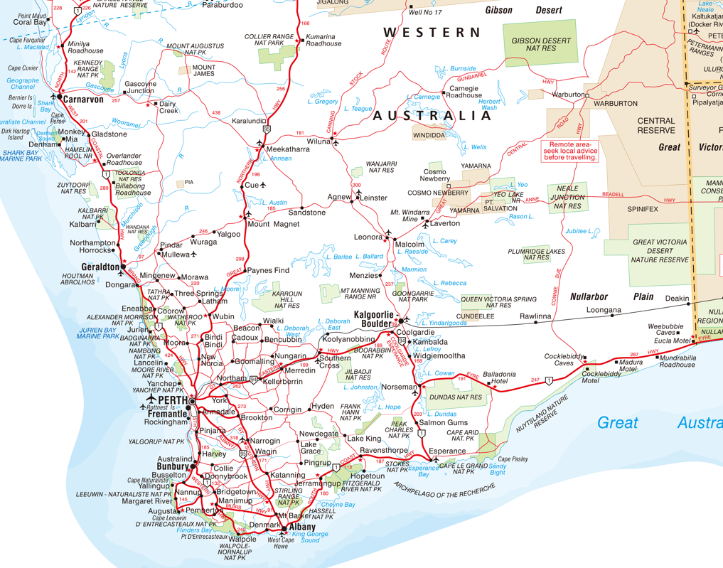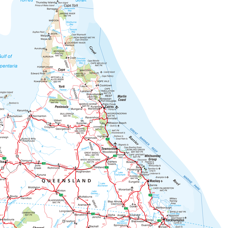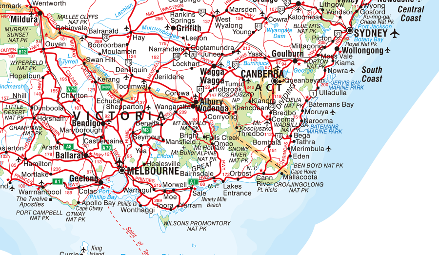 Yes, it highlights highways, well-known routes, and many national parks across Australia.