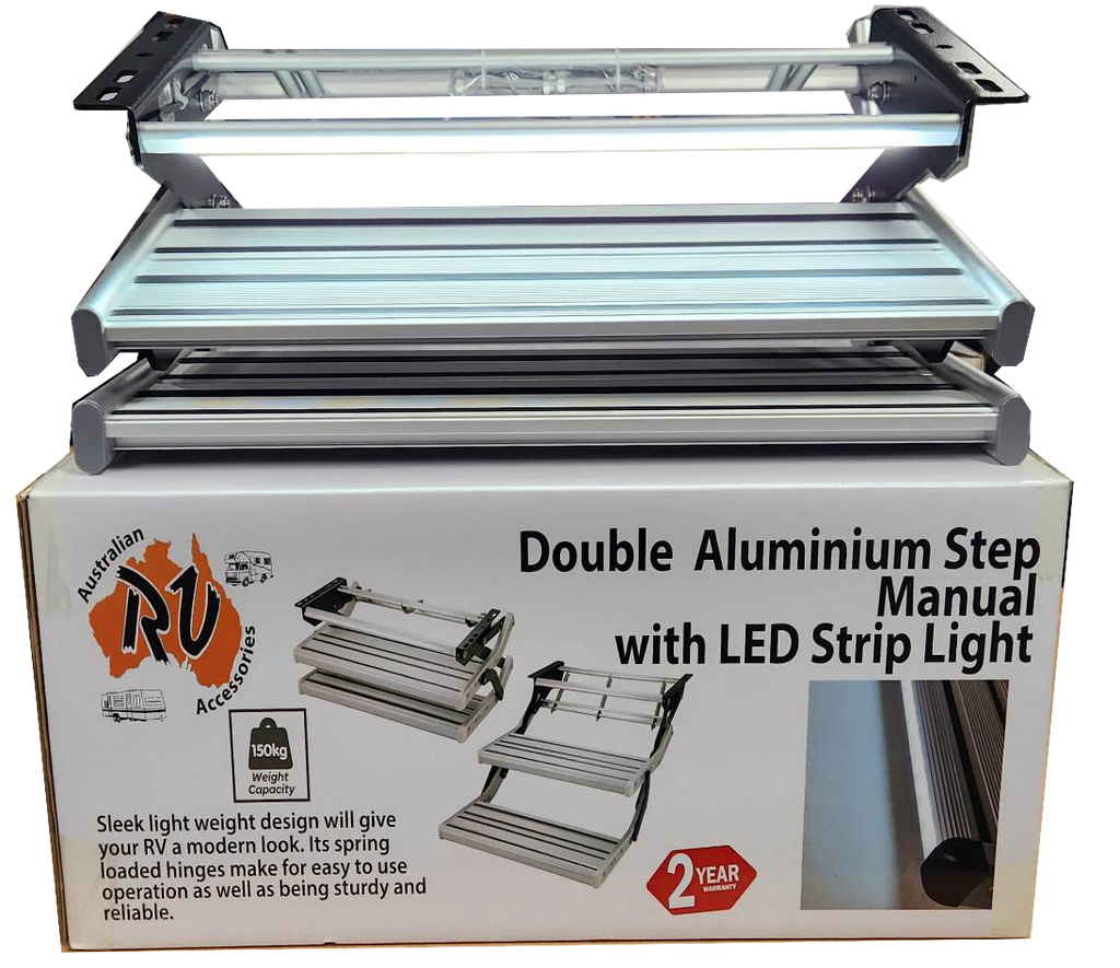 Crafted from high-strength aluminum alloy, the Australian RV Double Folding Manual Step ensures durability and reliability while enhancing your RV or caravan's entryway. This sturdy step features a robust design with added safety features and an integrated LED light for added visibility.