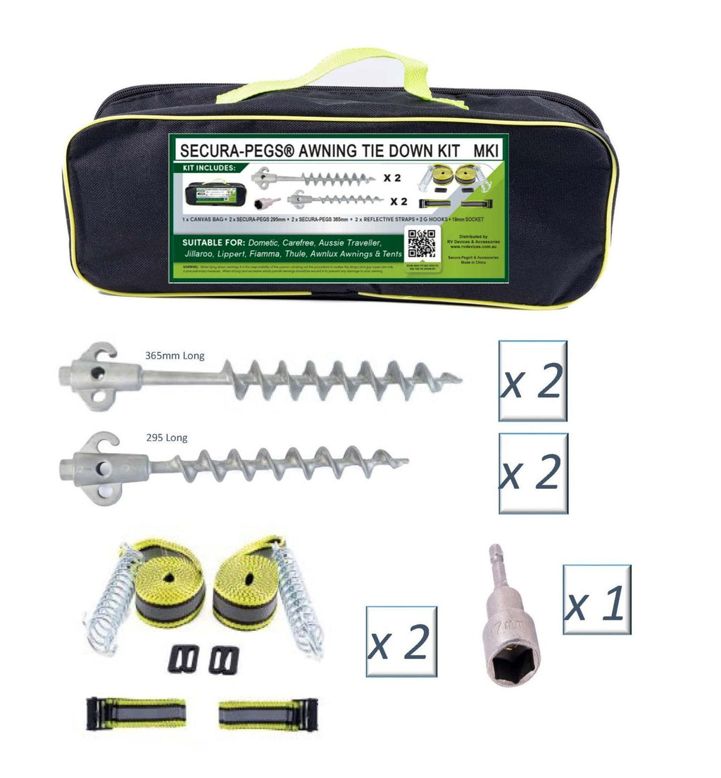 Awning Tie Down Kit Mk1 with Screw in Aluminum Secura-Pegs® Tent Pegs Camping