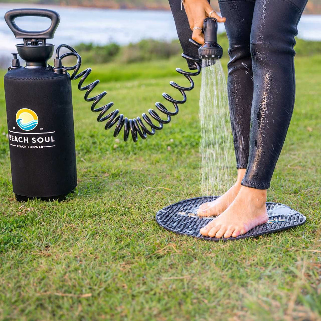 Elevate your Beach Soul Portable Shower experience with our Bag ‘n’ Mat.