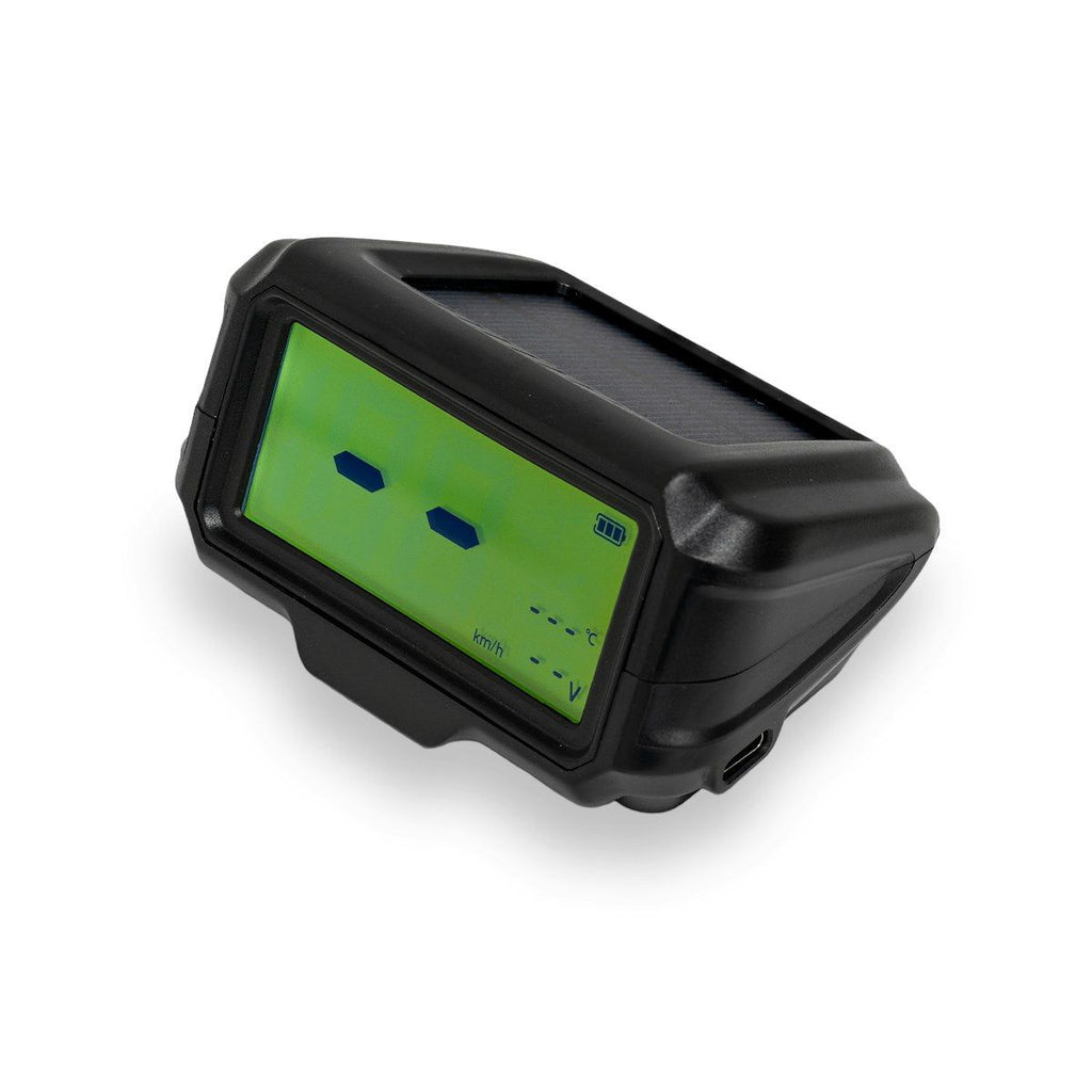 - Solar-charged head unit with backup USB charge cable