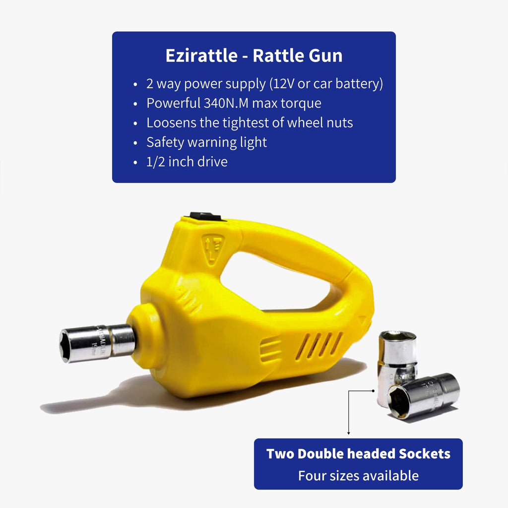 - 4 x wrench socket sizes 17mm, 19mm, 21mm and 23mm - please check that these fit your wheel nuts before you use the rattle gun. If not, they can be purchased at any hardware store.