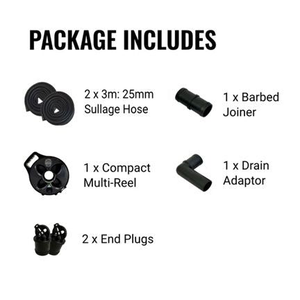 Includes: 2 x 3m 25mm hose, Compact Multi-Reel Matte Black, 2 End-Caps, 1 barbed straight joiner & 1 barbed elbow drain adaptor.