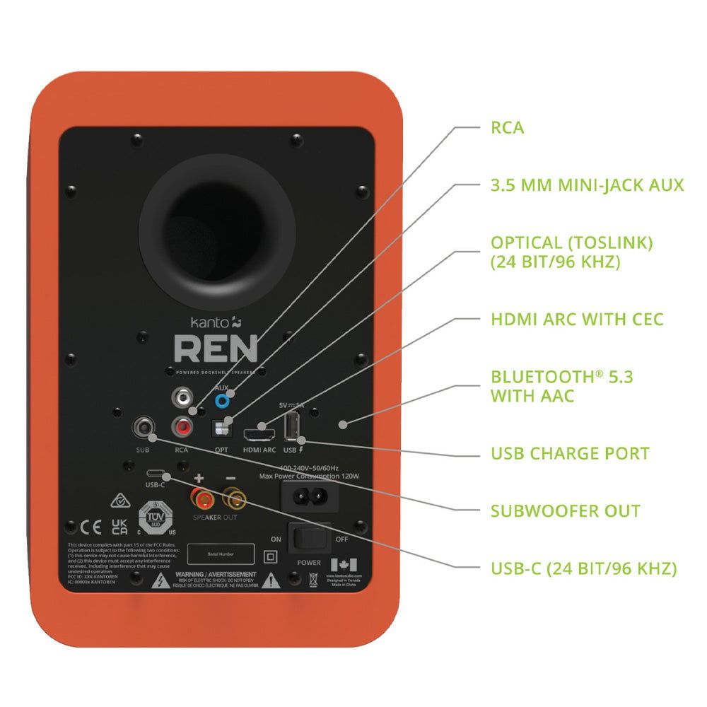 Kanto REN 200W Powered Bookshelf Speakers with HDMI ARC, USB-C, and Bluetooth 5.3 - Matte Orange, Pair - Blending the simplicity of a soundbar with the precision of a DSP-controlled stereo system, REN seamlessly connects to any modern TV via HDMI ARC, delivering a home theatre experience in a sleek, all-in-one setup. It eliminates the common frustration of muffled dialogue and overpowering sound effects with two specialised modes—enhancing vocals for clarity and reducing bass for late-night viewing. When paired with a subwoofer, REN intelligently filters out sub-bass from its 5.25” aluminium woofers, allowing them to focus on midrange frequencies with minimal distortion. Beyond the living room, REN’s versatility shines with Bluetooth 5.3 for smart home integration, optical input for WiFi streamers, USB-C for desktops, and analog inputs for ultimate compatibility.