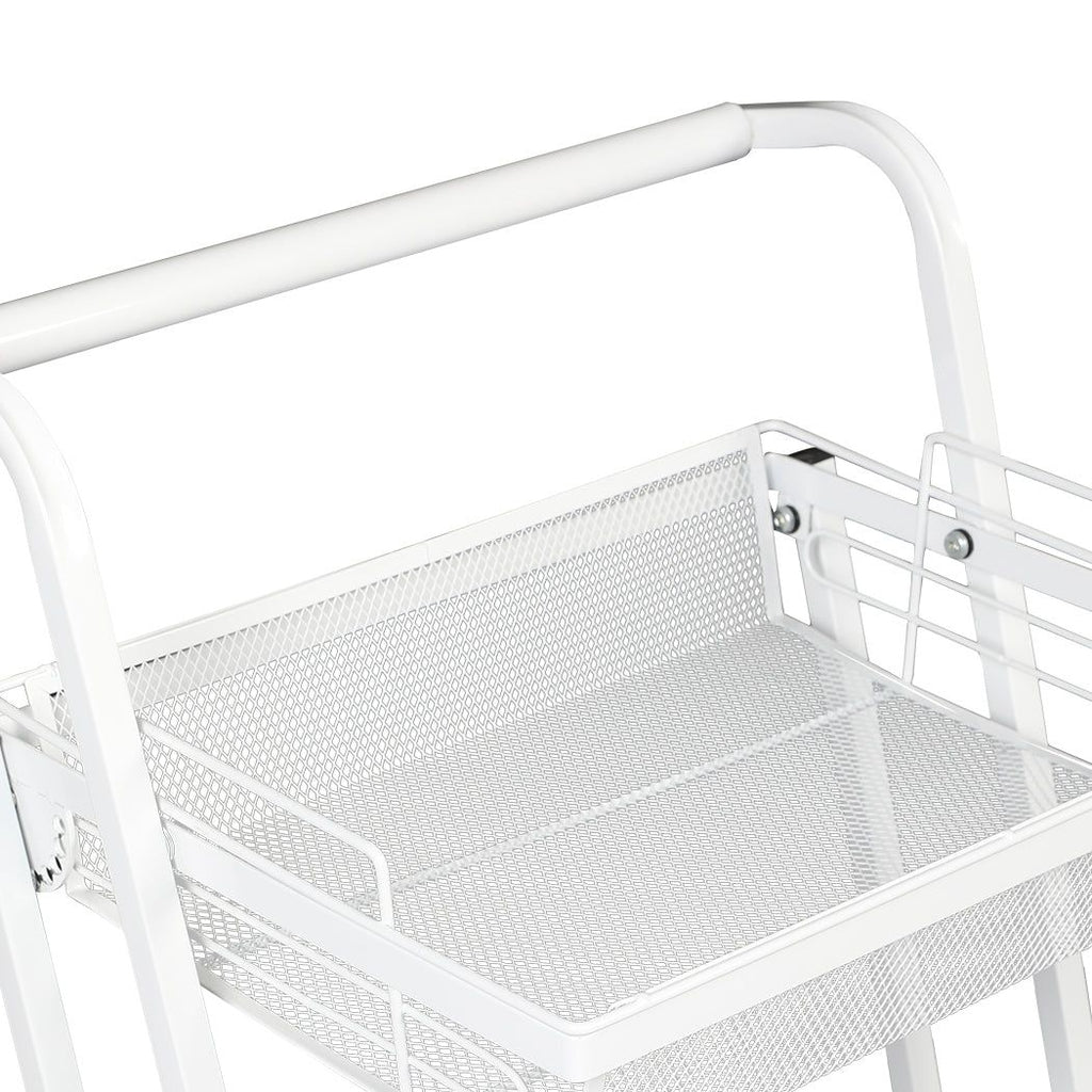 Roll your study and durable kitchen cart on wheels around. Your carts powder-coated carbon steel lasts and lasts. Round handle makes it comfortable to push. Free spinning castor wheels with brakes to stay put. Steel mesh baskets give air flow around your items.