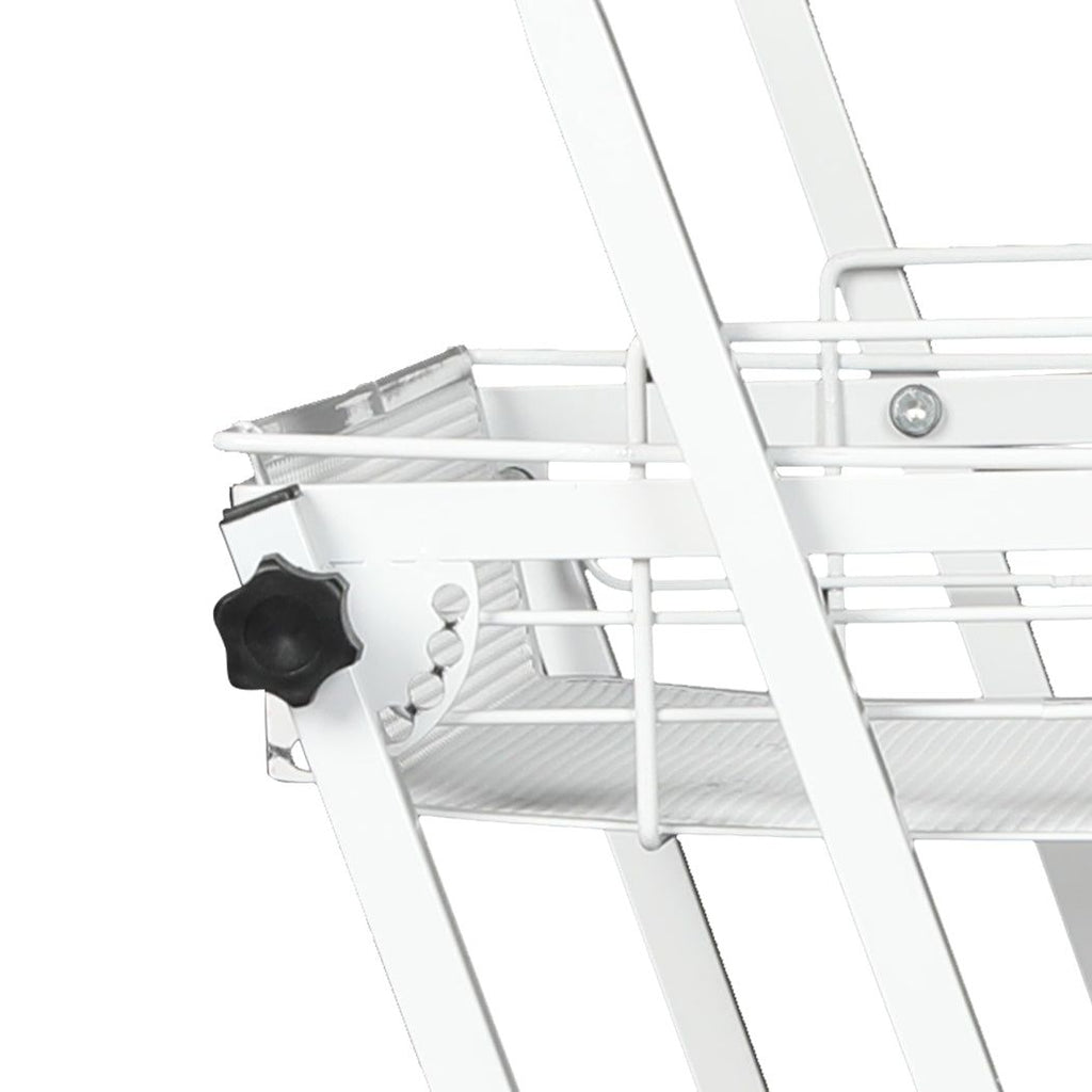 Conveniently roll your drawer trolley around the house. Need to save space in your kitchen? Adjust the angle of your shelves to full upright. Want a snack tray in the lounge? Turn the screw to rotate the baskets fully flat.