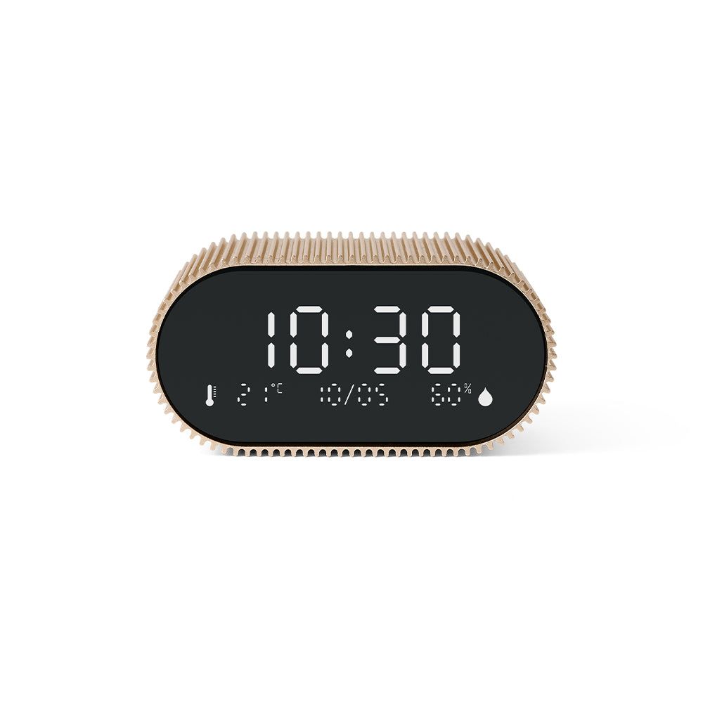 Lexon Ray Clock Lcd Alarm Clock With Temperature / Humidity Display - Gold - Discover Ray Clock alarm clock, the essential companion for gentle awakenings and peaceful nights. Equipped with a pure black VA LCD screen ensuring clear visibility at all times, ambient temperature and humidity sensors, it displays useful information for your daily well-being. Designed to be easy to use, simply tilt the alarm clock on its base to disable it and upright it to activate it. Ray Clock offers a wide choice of melodies and natural sounds to wake you up gently. Its night mode allows you to sleep peacefully, without being disturbed by the light of the screen. Ray Clock features a minimalist and elegant design, with its case made entirely of aluminum with unique stripes which will bring a touch of modernity to your room. Available in many colours, it will fit harmoniously into your interior. Offering up to 6 months of battery life, Ray Clock is rechargeable via USB-C. Say goodbye to the hassle of dead batteries! You can rely on your alarm clock to accompany you for several months without worrying about frequent recharging.