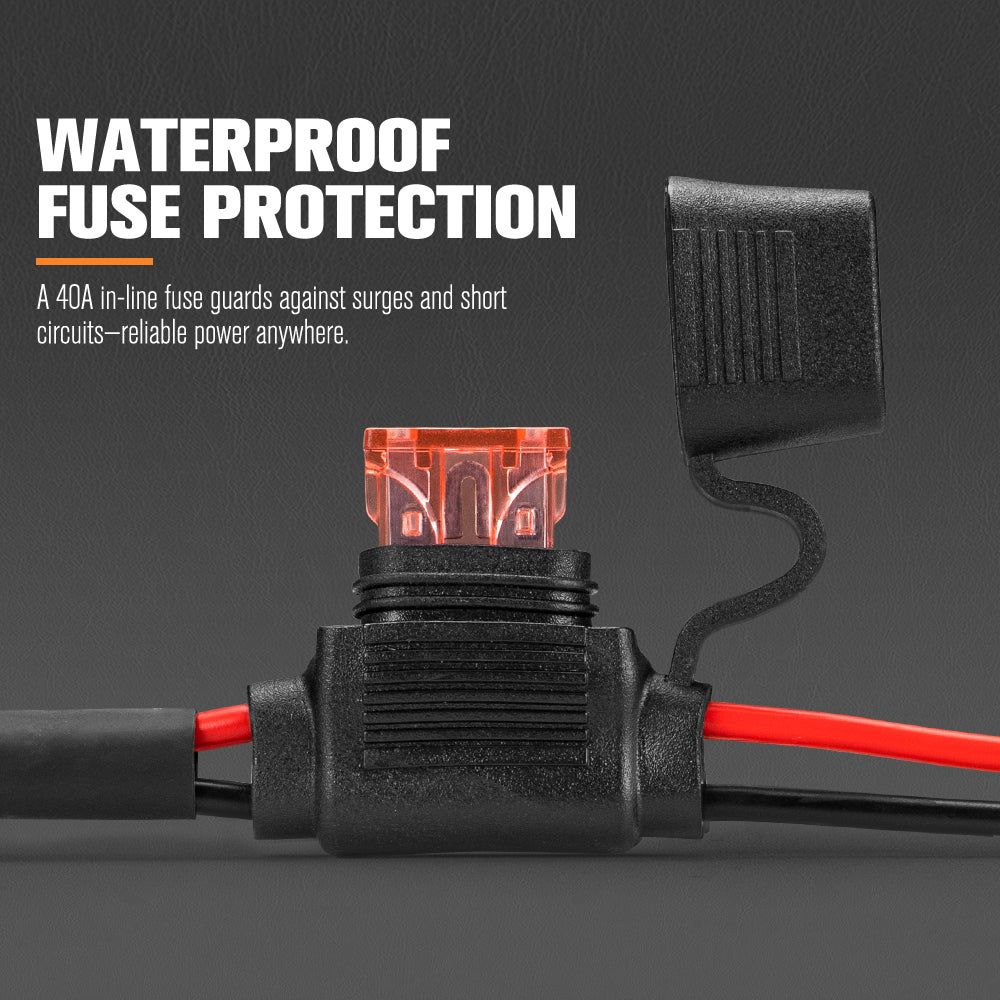Integrated Fuse: Equipped with a waterproof 40A in-line fuse for essential
