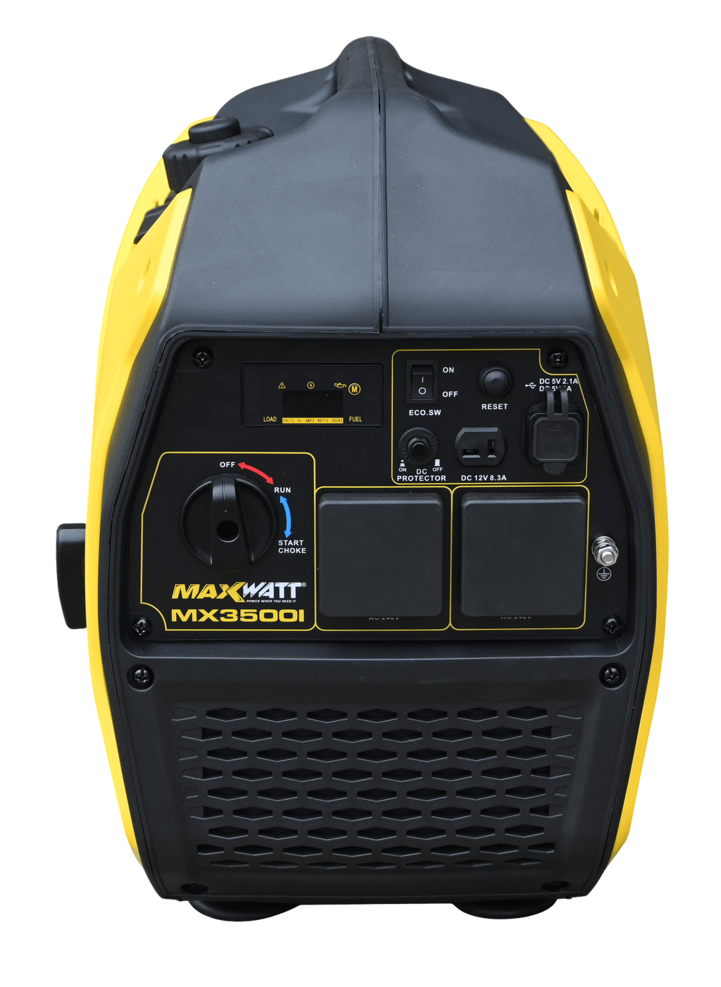 MaxWatt 3500W Petrol Pure Sine Wave Silent Digital Inverter Generator with Recoil Start, 2 Year Warranty. Maxwatt® petrol generators offer the best in portable power, fuel efficiency and are super silent. Besides the electrical output being able to power all sensitive equipment, the MX3500I is perfect for home use as a backup power supply. This generator has a rated output of 3000 watts with a maximum output of 3500 watts.