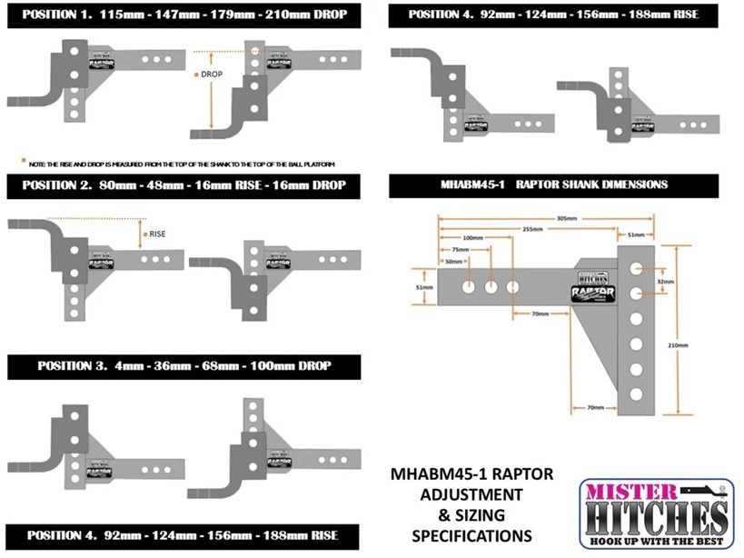 Mister Hitches Raptor 4.5T Super Duty Adjustable Ball Mount 16 Stage
