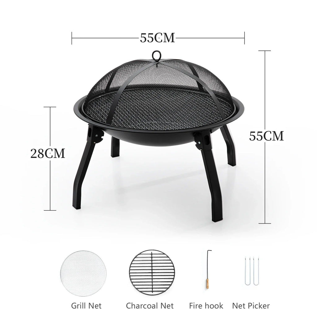 Outdoor Charcoal Fire Pit Portable Iron Fire Bowl with Folding Legs Black