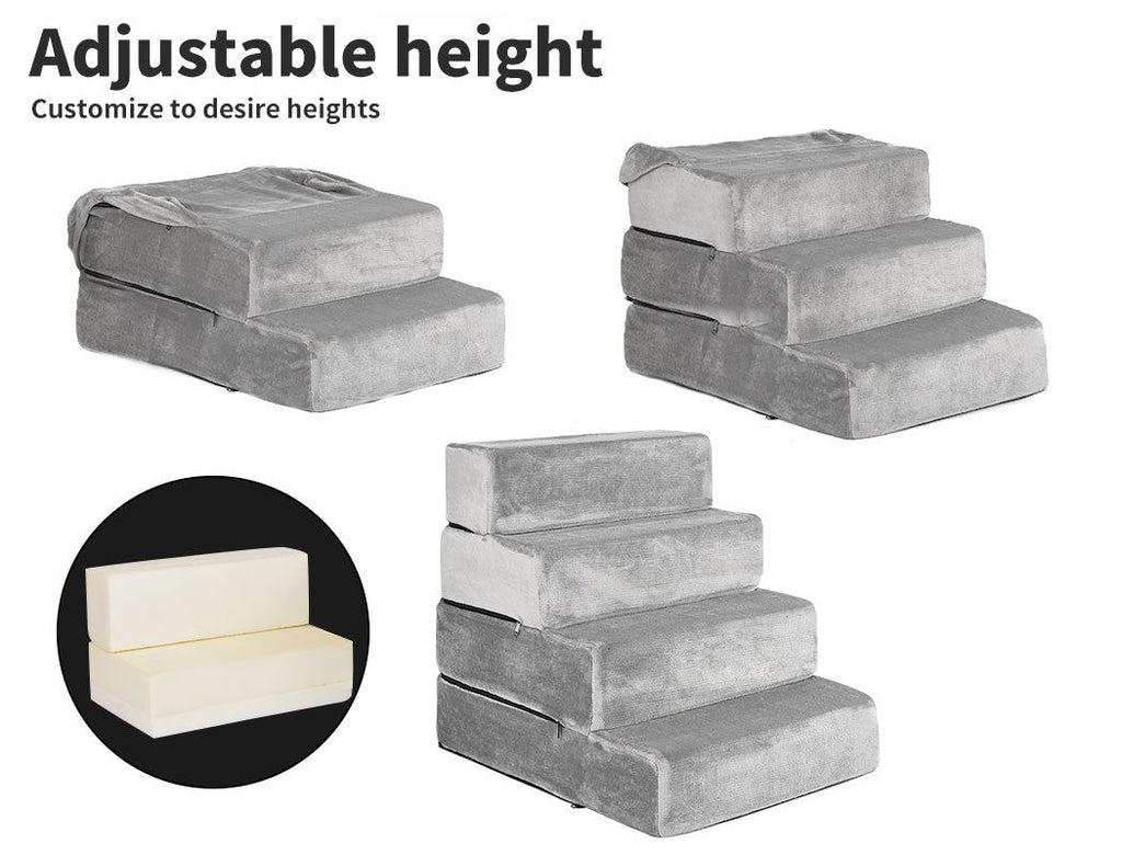 Adjust to height your pet desires. With its unique foam design adjust easily to the height you may desire. Portable and flexible helps you and your pet. To improve its comfort built-in high-density foam is provided. Which makes it very much reliable and durable. Anti-slip bottom provided on the steps ensures greater stability for your pet to climb. Clean it simple and easy with its zipper enclosure design. An all-season product for your pet. Ease their pain ease their worry. For a happy and lovely cuddle.