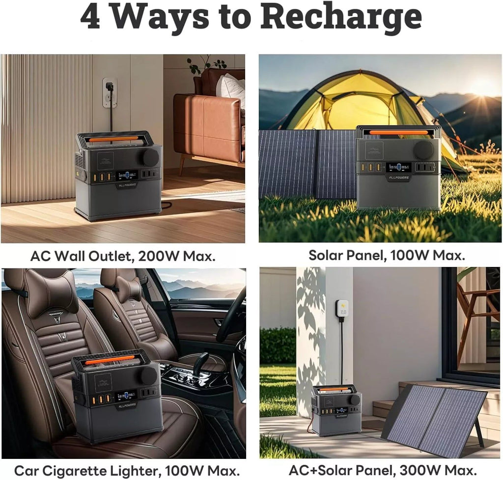 - 4 ways to charge the unit: solar, AC adapter, car charger, USB-C.>