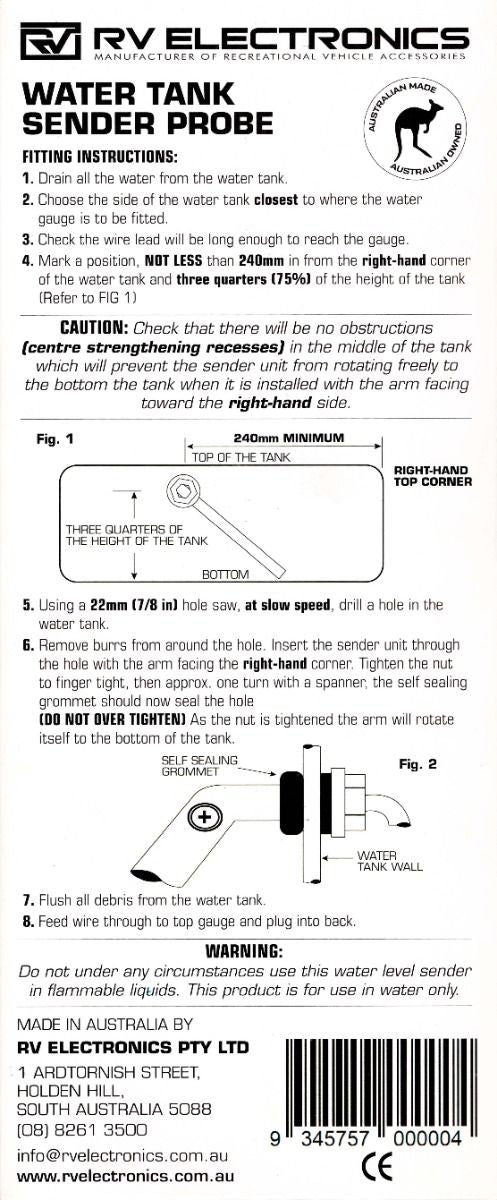 RV Electronics Standard Sender for RV Water Gauge - 2.5M Lead