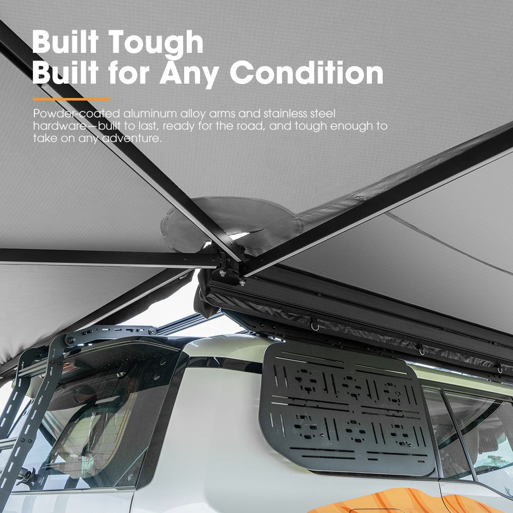 Freestanding Confidence: The Pivot Axis Hinge System lets the awning stand completely on its own. No legs required, just pure stability, able to handle winds up to 30 km/hr.