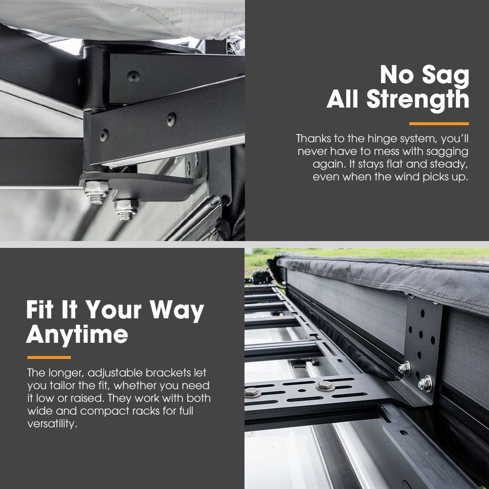 No Sagging: Forget the hassle of constant adjustments. Our hinge system ensures a flat, stable awning that stays put, even in strong winds—unlike many others that sag.