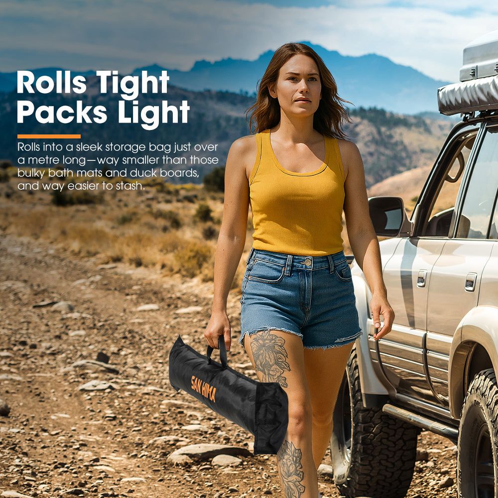 Compact & Travel-Friendly: Rolls up neatly into a sleek bag just over a metre long—lighter and easier to store than any plastic mat or wooden platform.