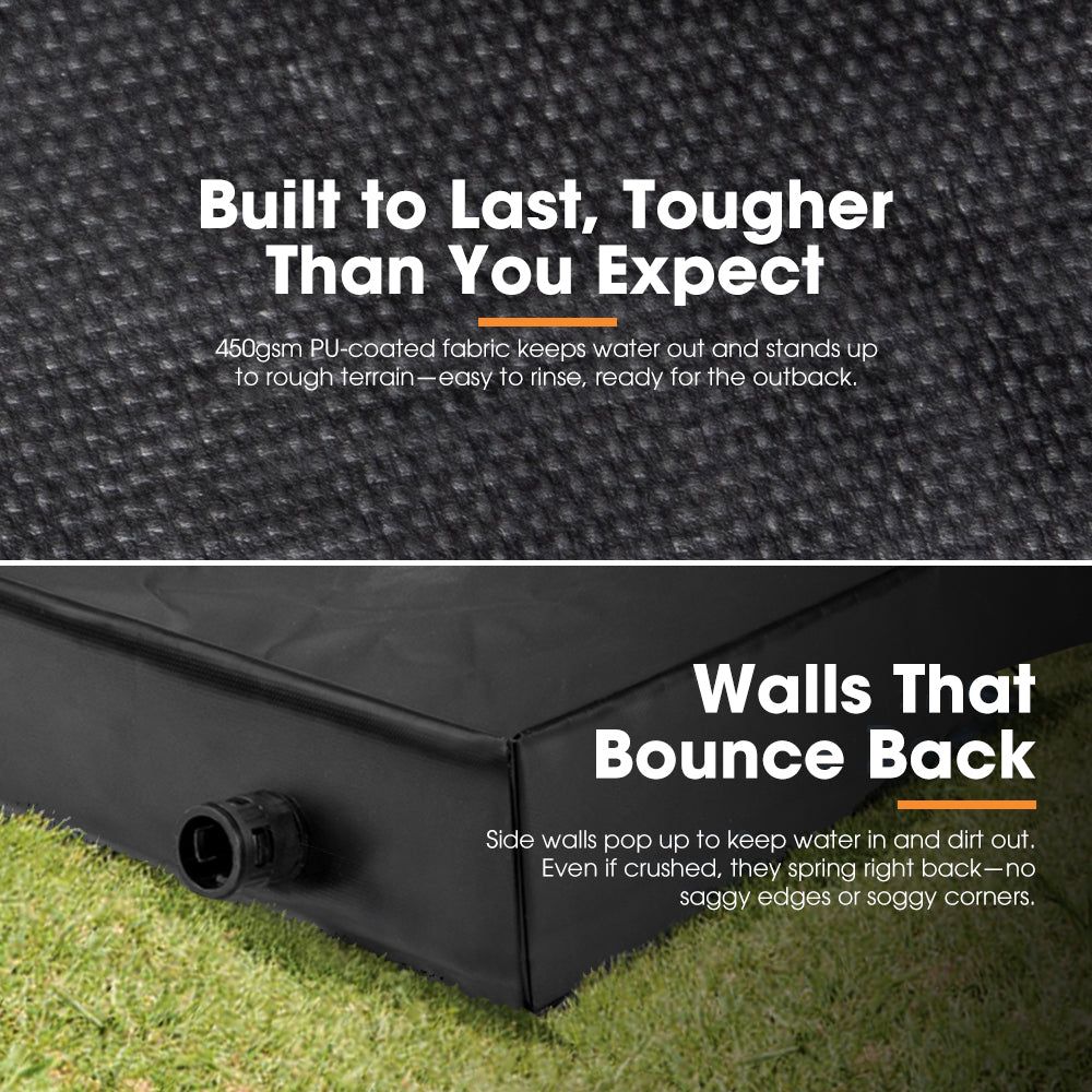 Spring-Back Sidewalls: Flexible sidewalls keep the water in and dirt out—and if crushed, they bounce right back into shape. No sagging or folding edges.