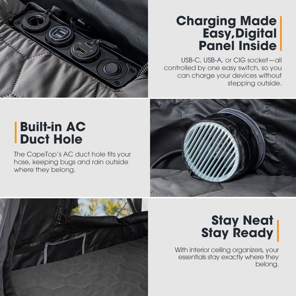 Built-in AC Duct Hole: Our CapeTop fold out rooftop tent features an air conditioner duct hole that easily accommodates the AC hose, keeping out bugs and rain.