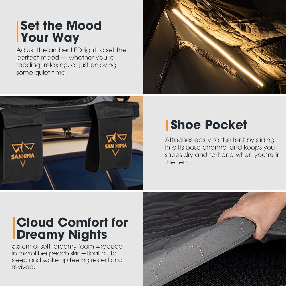 Brighten Your Ambiance: The adjustable amber LED strip of the fold out rooftop tent adds the perfect touch, making reading or relaxing feel extra special.