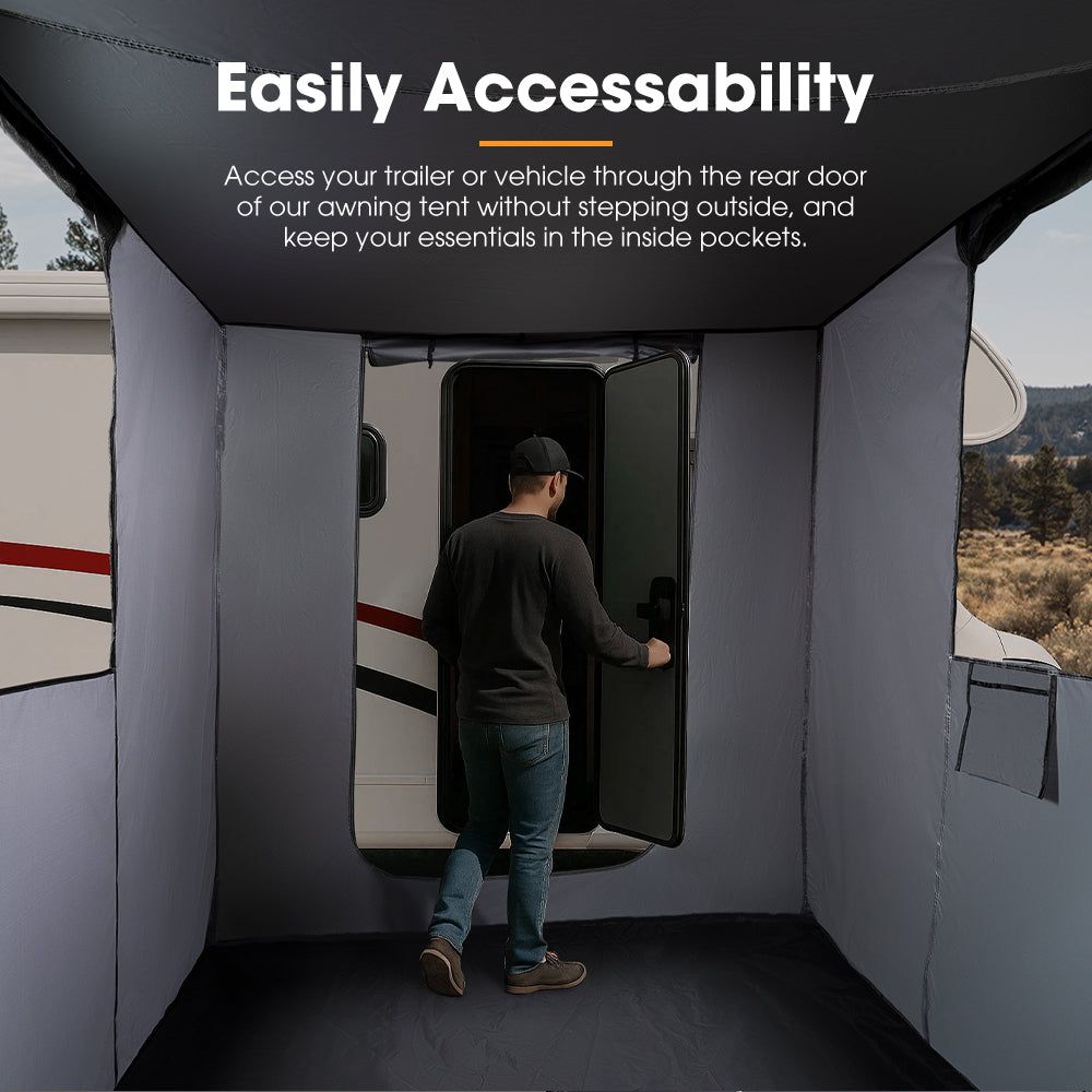 Easily Accessability: Access your trailer or vehicle through the rear door of our awning tent without stepping outside, and keep your essentials in the inside pockets.