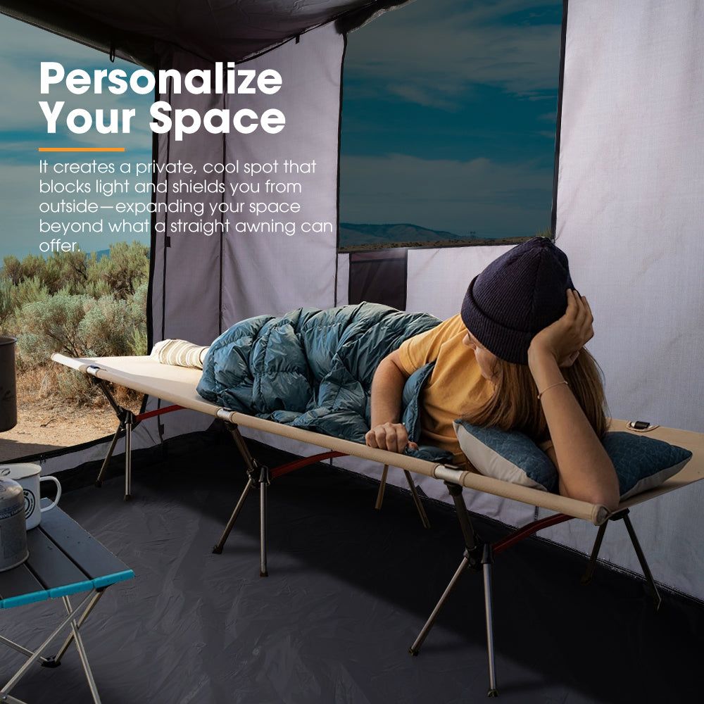 Quick Setup: Forget about poles and complicated steps! Just Velcro our awning tent, slide it into place with the front track with zip flange, zip it up, and you're set!