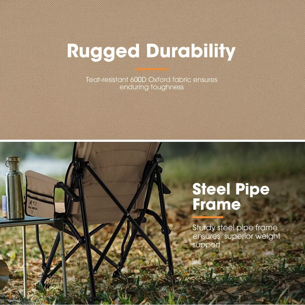 Rugged Durability: Crafted from tear-resistant 600D Oxford fabric and sturdy steel pipe frame, our camping chair ensures enduring toughness and supports up to 200kg.