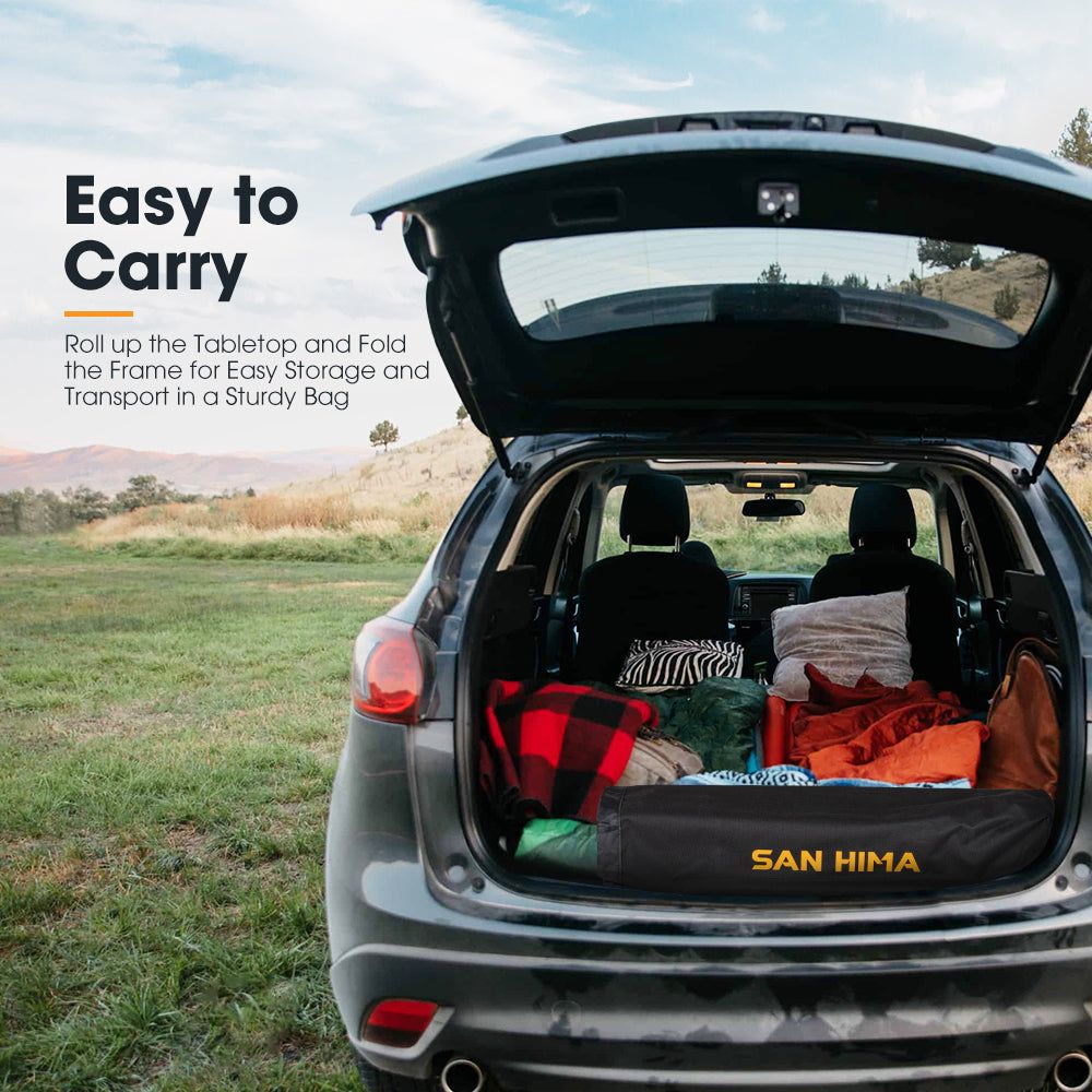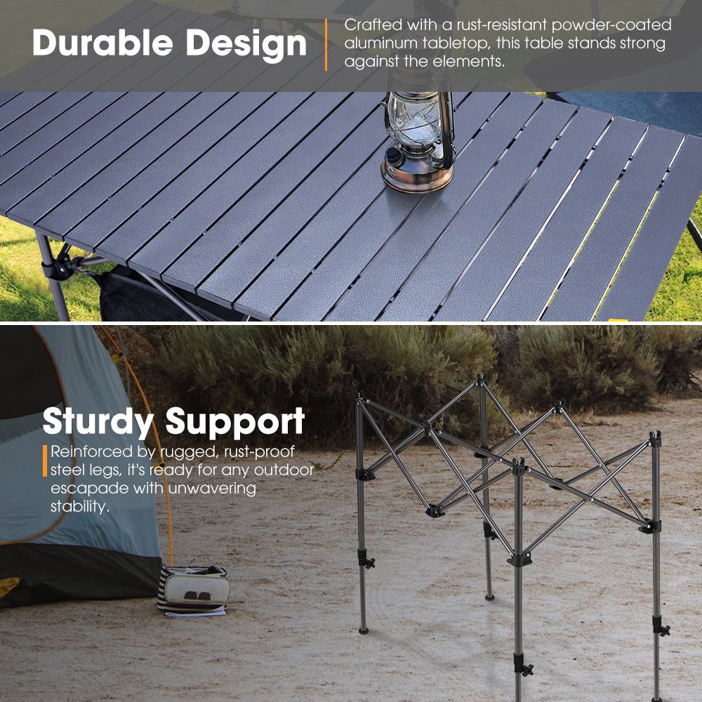 Easy Portability: Roll up the aluminum slat tabletop and fold the table frame