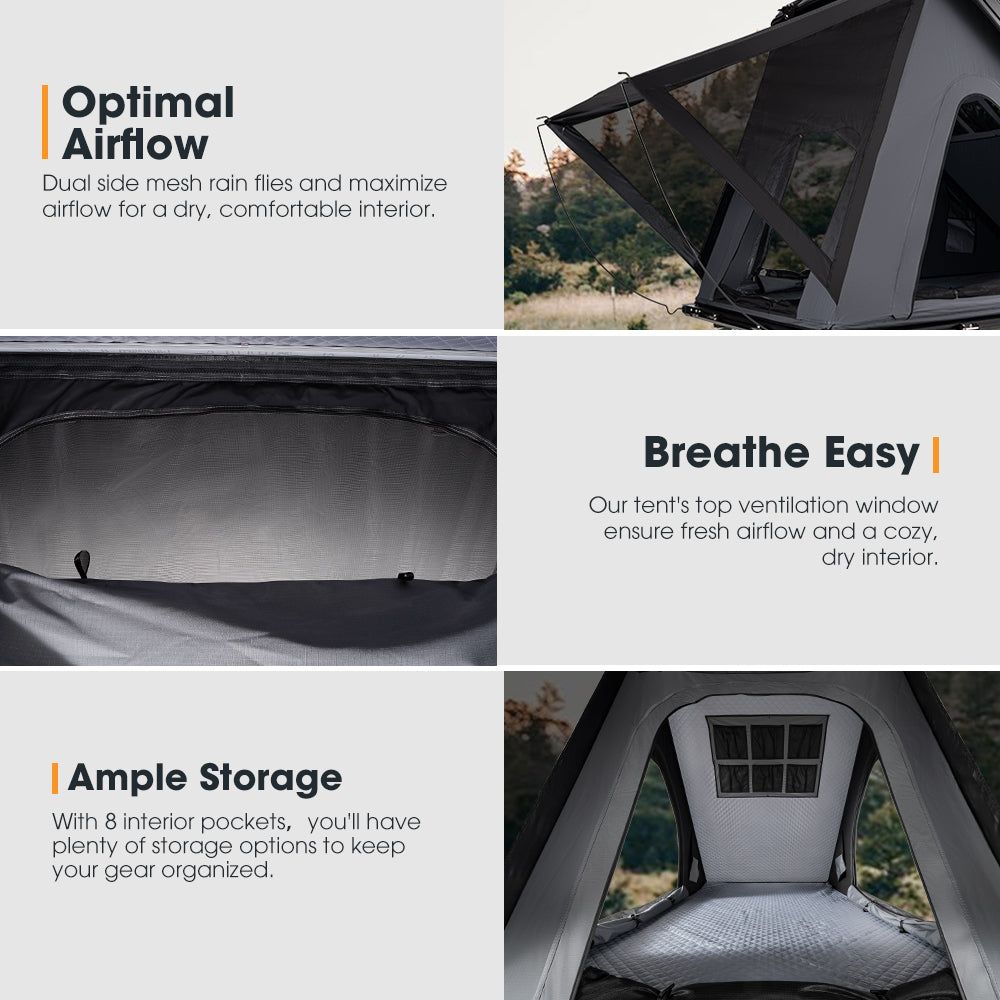 Optimal Ventilation: Dual side windows with mesh rain flies and a ceiling