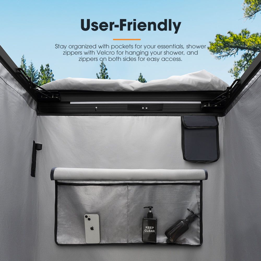 User-Friendly: Stay organized with pockets for your essentials, shower zippers with Velcro for hanging your shower, and zippers on both sides for easy access.