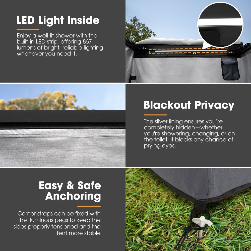 First off, the swing arm lets you access your gear without having to awkwardly maneuver around the setup, especially when you’ve got a bunch of stuff. The roof rolls back for fresh air, but when privacy’s a priority—whether you’re showering, changing, or using the toilet—the roof can be rolled up for full coverage. Made with 420D Oxford fabric and 280GT polyester-cotton, this shower tent is water-resistant (5,000mm) and offers UPF 50+ protection. The silver lining blocks any silhouettes, while the built-in LED light makes sure you’re never in the dark. With pockets for towels, clothes, and shower zippers with Velcro, everything’s within arm’s reach, making showering hassle-free.