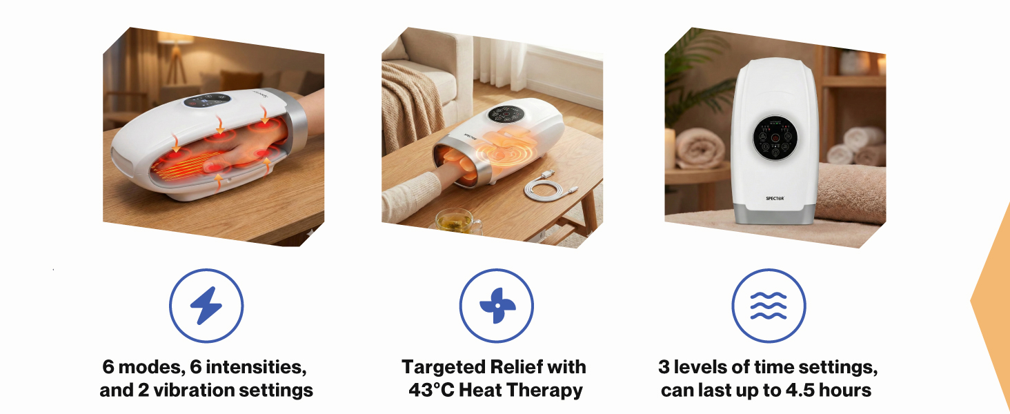 Introduction Give your hands the care they deserve with the Spector Cordless Hand Massager. Ideally suited for relieving joint stiffness warming cold fingers or soothing daily strain this advanced device delivers a comprehensive massage. By combining rhythmic air compression with therapeutic heat it helps melt away tension and restore comfort. It is more than just a tool; it is a daily luxury that fits seamlessly into your routine making it a perfect gift for family and friends.