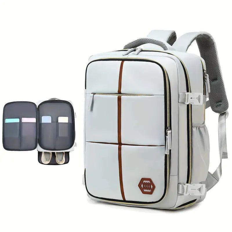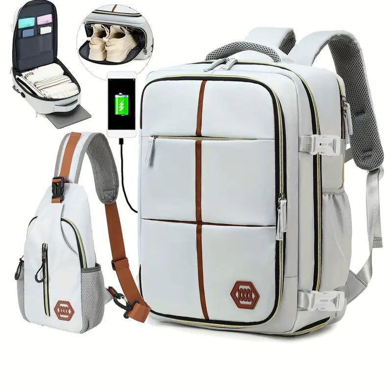 Description: Experience the perfect blend of style and functionality with our Multifunctional Travel Backpack. Crafted from durable polyester material in an elegant silver gray hue, this backpack is designed to meet the needs of modern travelers. The airline-approved laptop compartment ensures easy passage through airport security checkpoints, while the spacious main compartment provides ample space for your belongings. Keep your shoes separate and organized in the dedicated compartment, while the water-resistant exterior protects your essentials from unexpected weather conditions. Plus, stay connected on the go with the integrated USB charging port, allowing you to charge your devices conveniently. Complete with adjustable straps for personalized comfort and a bonus chest bag for added versatility, this backpack is your perfect companion for travel, work, school, and outdoor adventures.